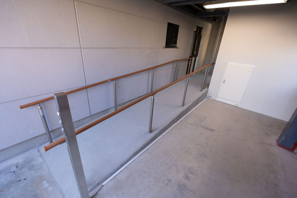 これに対しては、床面を上げたうえでスロープを設置し、昇降距離を制限内に収める方法で対応しました。